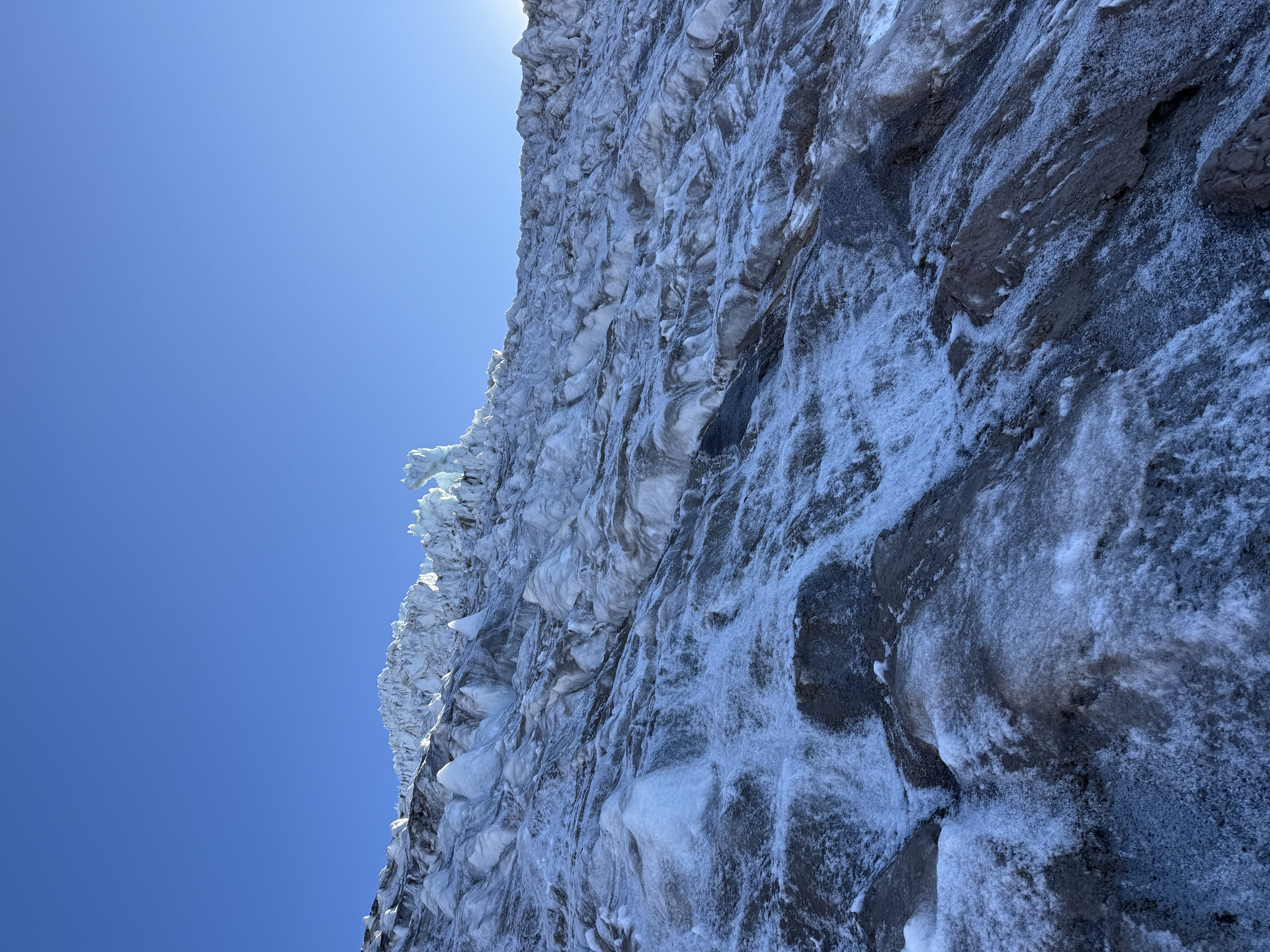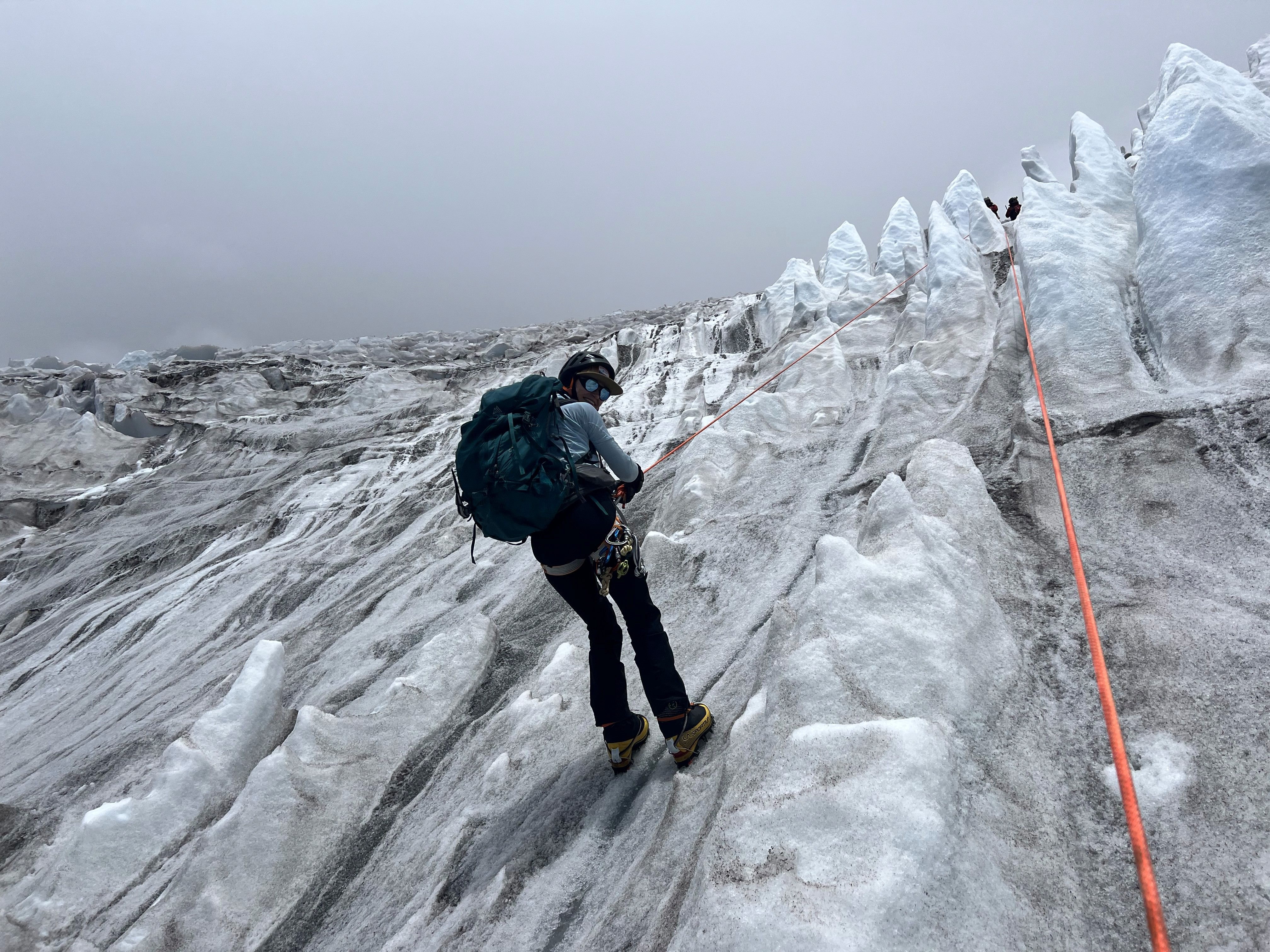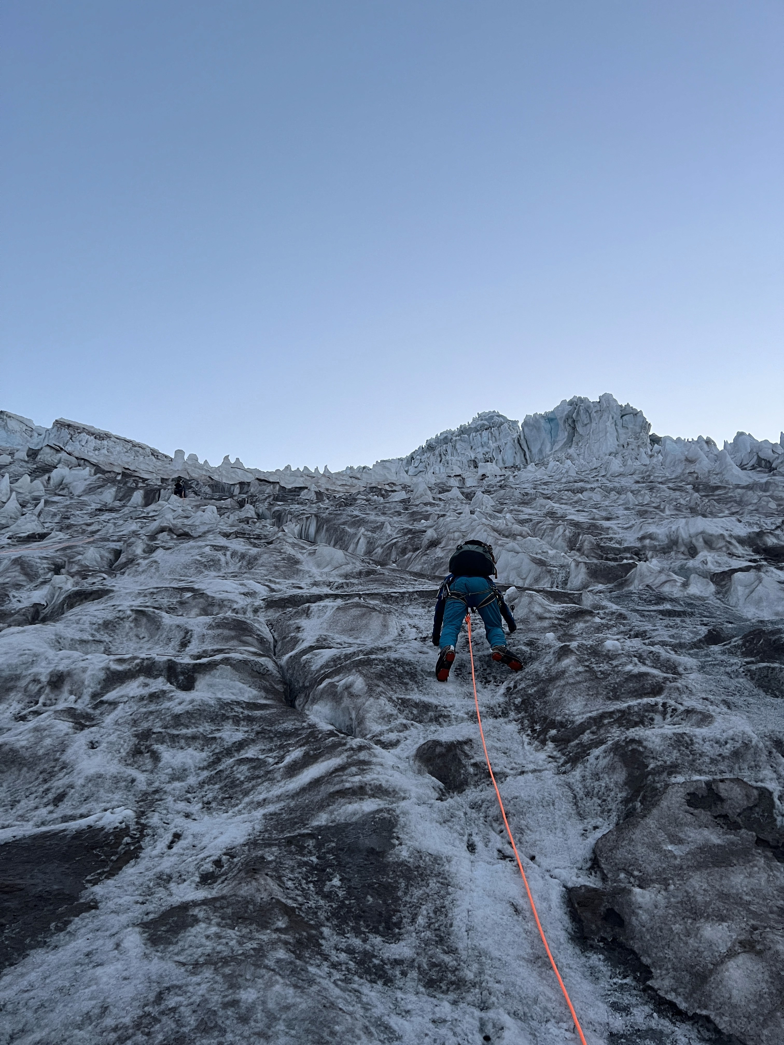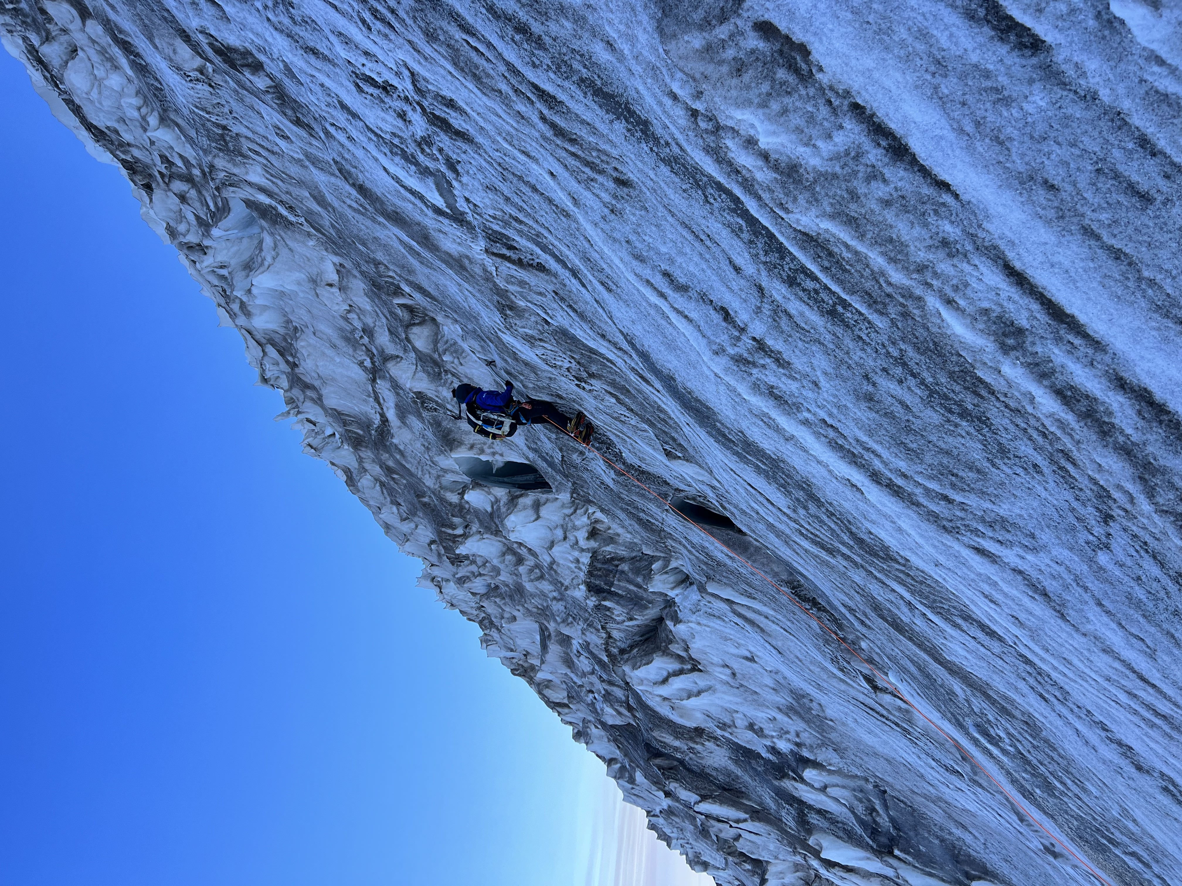 Sharp crampons with vertical front points work best for this ice climbing route. Check our gear list for the current best model.
