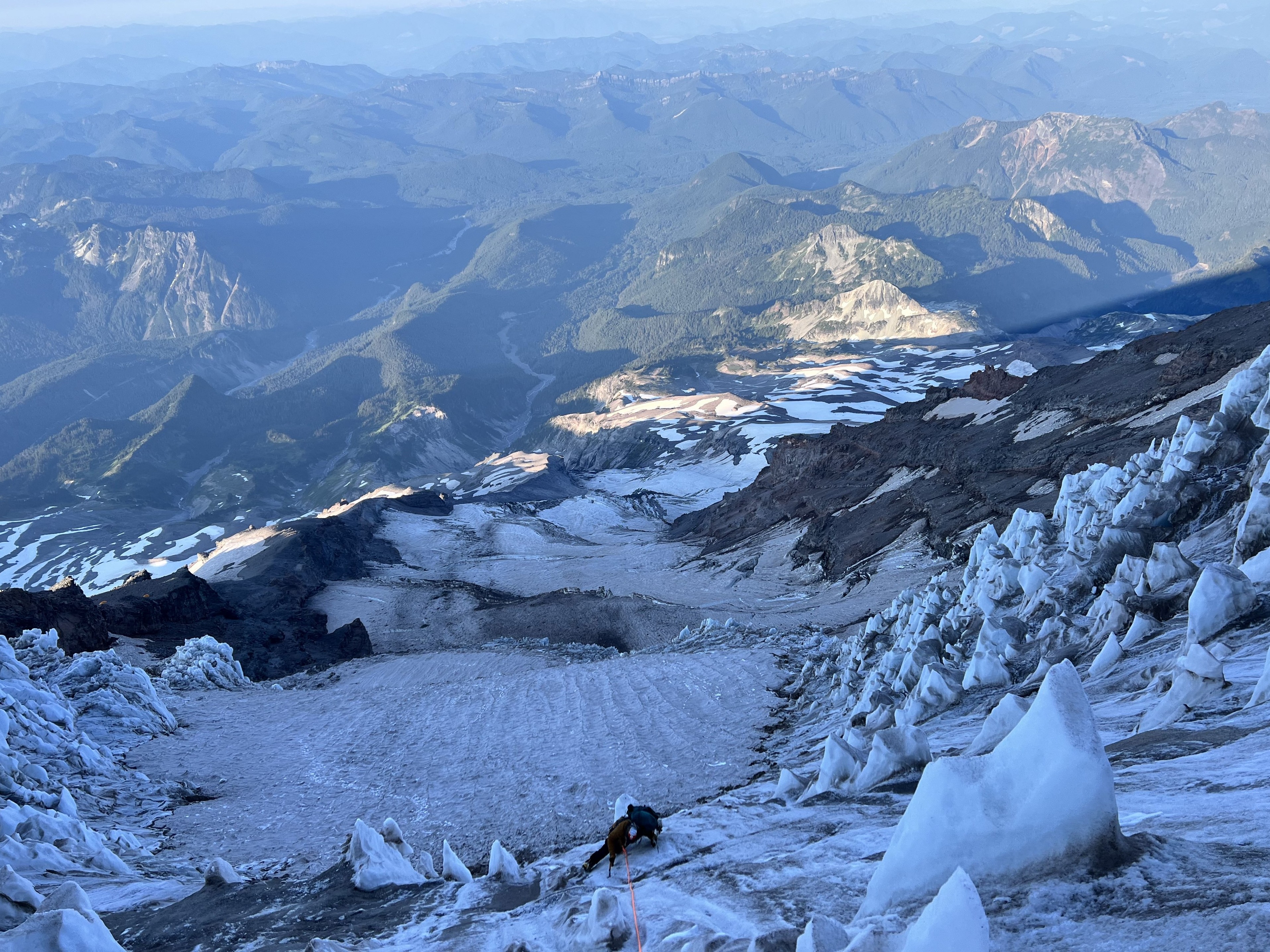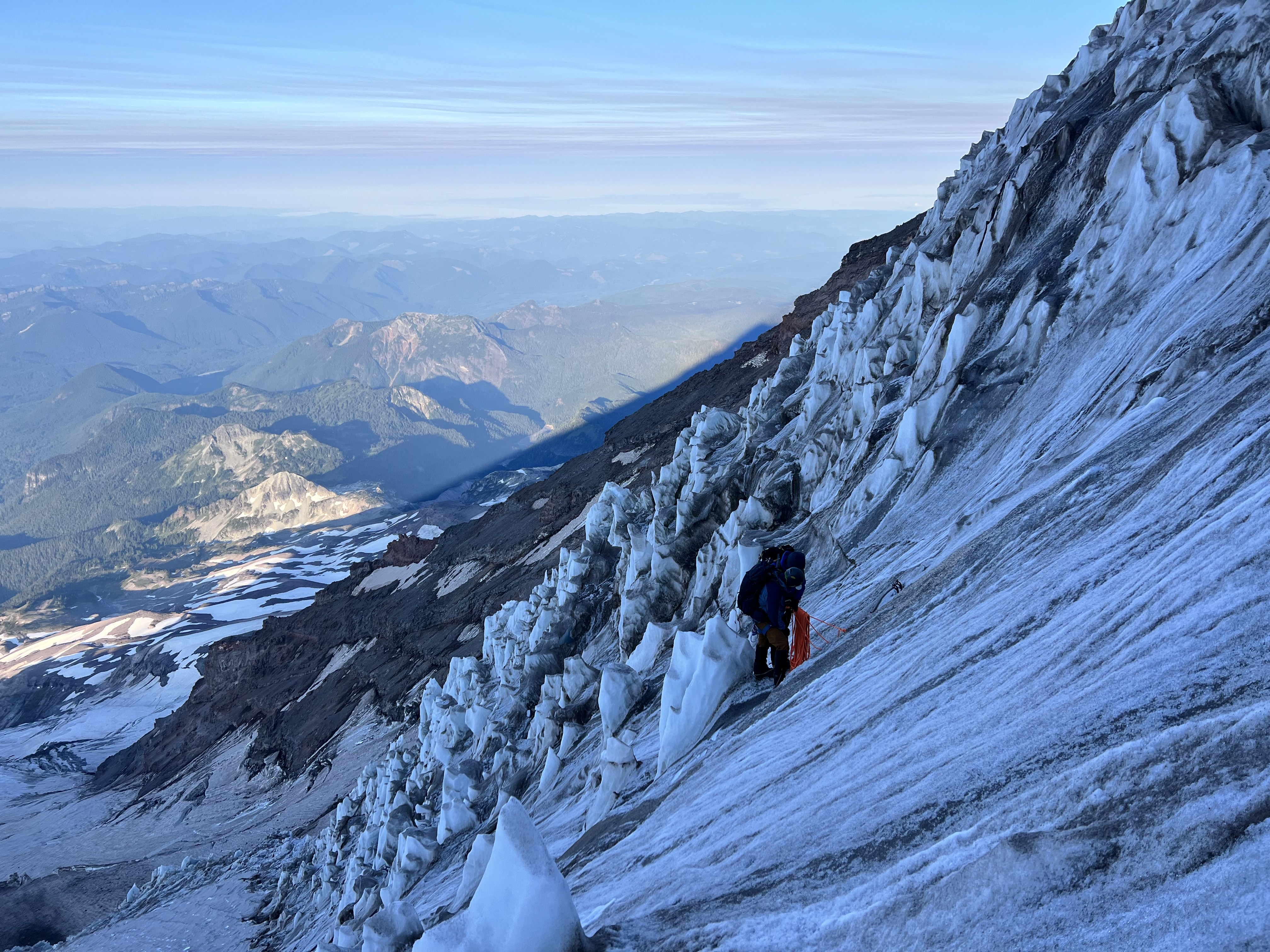This adventure begins at the popular Paradise area in Mt. Rainier (Tahoma) National Park. We will quickly lose the crowds as we bear west and decend onto the massive Nisqually Glacier. After traversing the glacier and gaining a prominent ridge we will arrive at our first camp, The Castle. The following morning we will move camp higher to Camp Hazard (named after Hazard Stevens, who completed the first documented summit of the mountain in 1870). Here we will enjoy the stunning views looking south at Mt. St. Helens, Mt. Adams, and all the way into Oregon on a clear day where we can spot Mt. Hood and ocassionalty Mt. Jefferson. We will rise for an alpine start and enjoy fantastic ice climbing followed by glacier travel to the summit. This climb feels truly remote as it sees far less traffic than many of the other routes on the mountain. It is also a great opportunity to develope ice climbing skills as well as glacier travel skills. Climbing the Kautz is an adventure you won't soon forget!